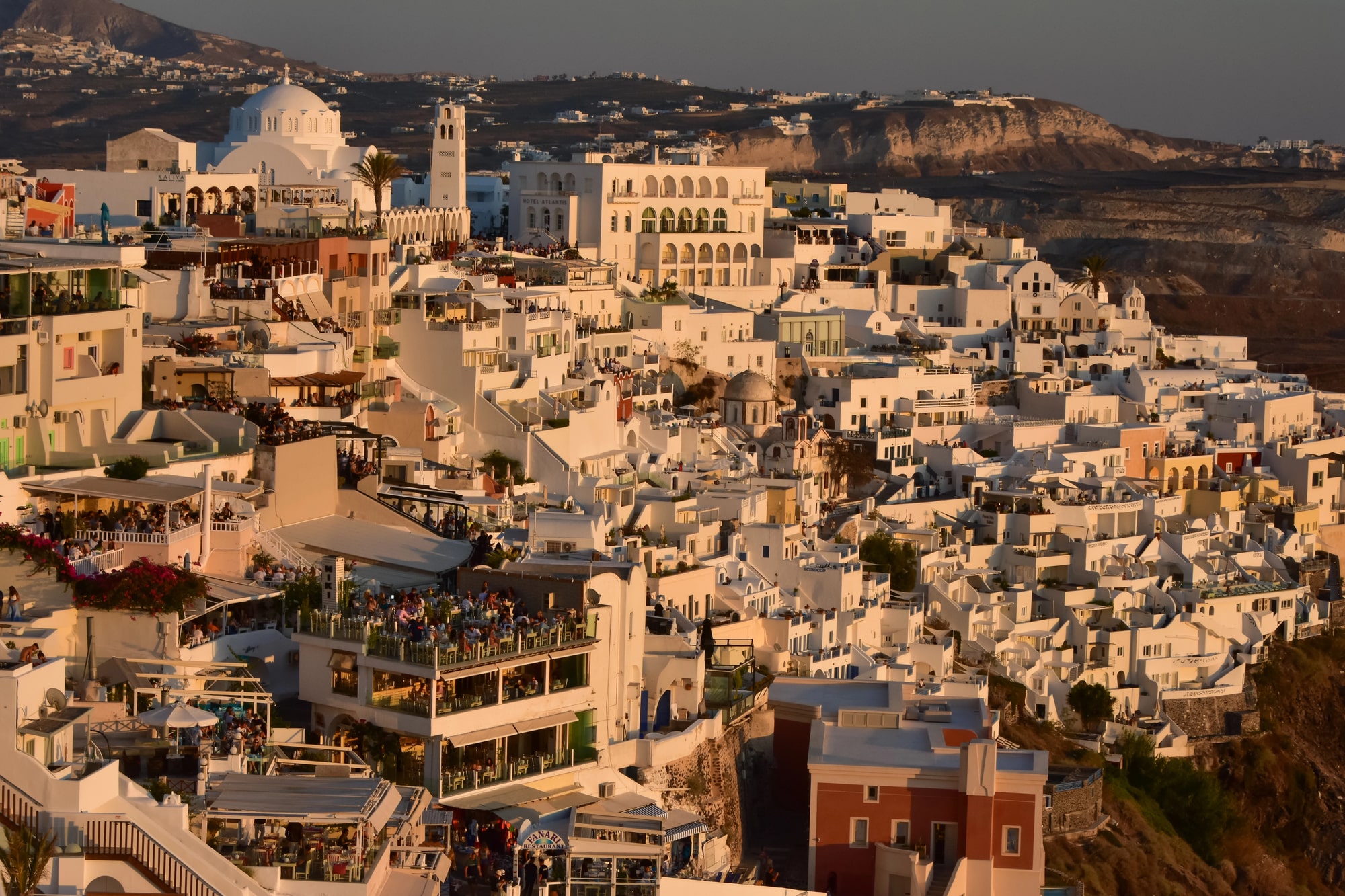 Restauranter og butikker er de dyreste på øen, og det “autentiske” Santorini kan være svært at finde bag alle de turistfælder. Om aftenen efter solnedgang roer det sig dog ned, og den magiske stemning vender tilbage.