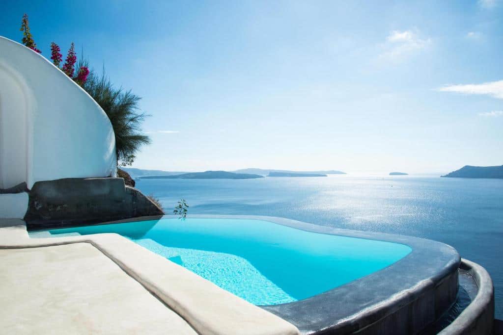 Et legendarisk Santorini-hotel med 20 private huse hugget ind i klippen, mange med panoramaterrasser og private pools. Perivolas’ infinity pool er en af de mest ikoniske på hele øen – den ser ud til at smelte sammen med det Ægæiske Hav nedenunder.