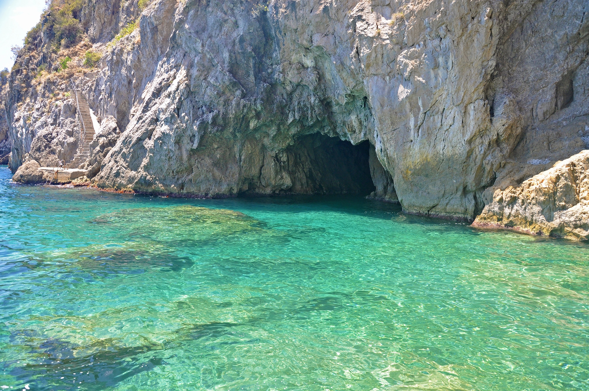 Grotten blev først opdaget i 1932. På bunden af det krystalklare vand kan du se en undervandsudgave af et julekrybbespil i keramik, som er blevet placeret der af lokale dykkere. Entré koster cirka €5-7 pr. person. Du kan nå grotten med elevator eller trappe fra kystvejen (SS163), eller som stop på en bådtur. Bådturen er klart den bedste måde at opleve den på – du sejler direkte ind i grotten i en lille robåd.